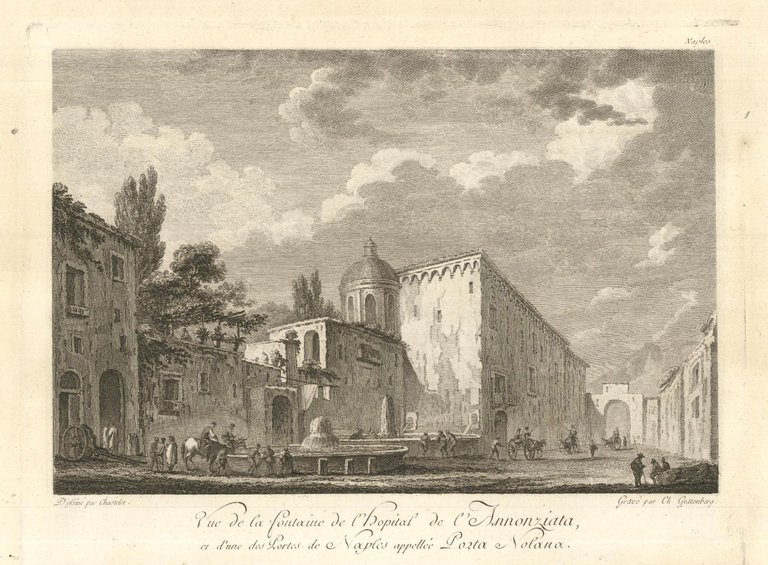 Vue de la Fontaine de l'hopital de l'Annonziata, et d'une des Portes de Naples appellée Porta Nolana