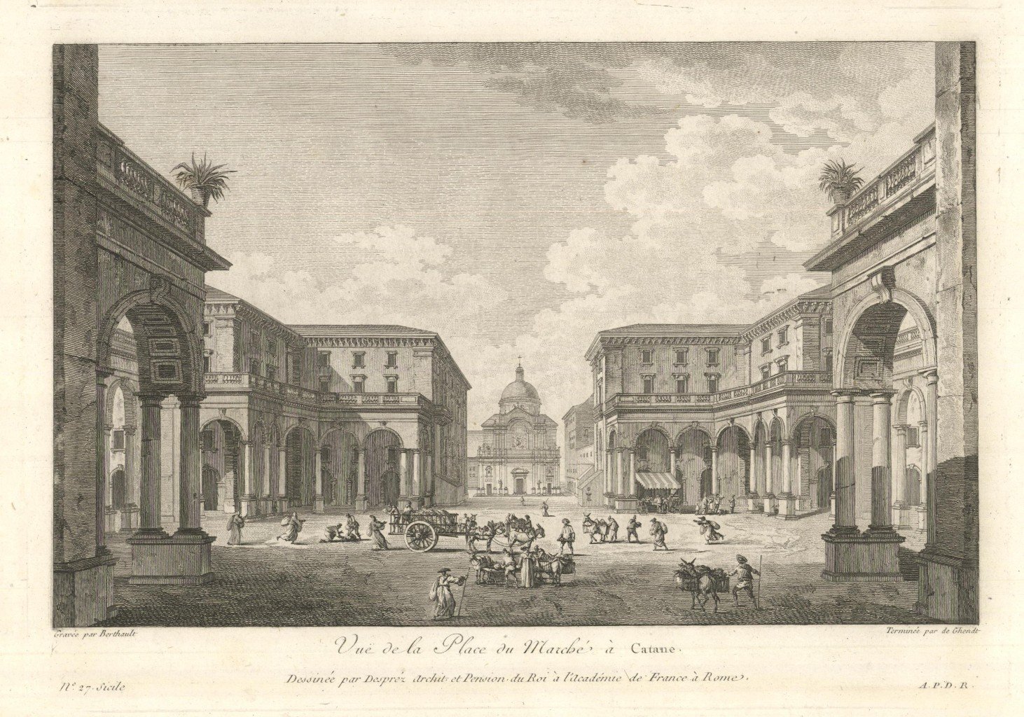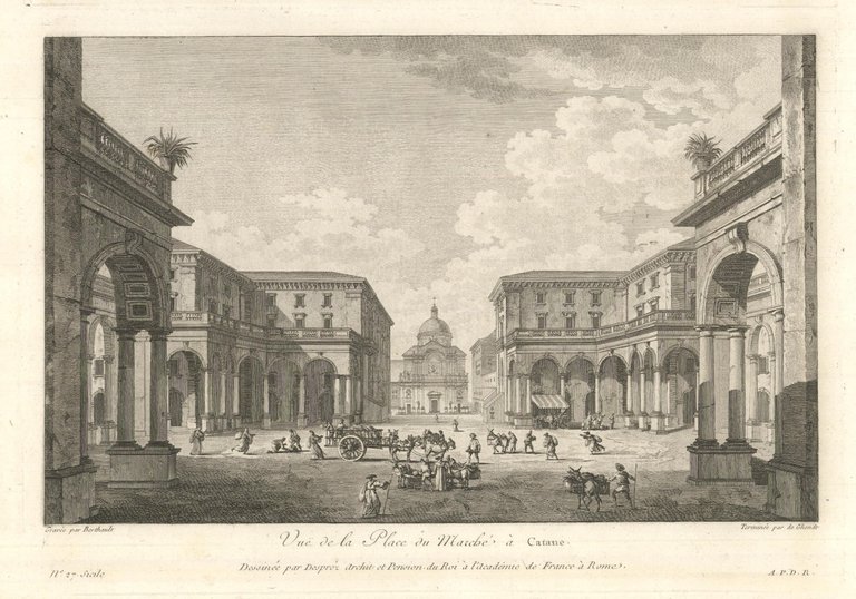 Veduta della bella piazza, limitata da palazzi con portici, animata da alcuni personaggi. Tratta dalla prima edizione della monumentale opera edita da Jean-Claude Richard de Saint-Non, meglio noto come Abate di Saint-Non " Voyage ou Description des Royaumes de Naples et de Sicilie ". Pubblicata a Parigi dal 1781 al 1786.