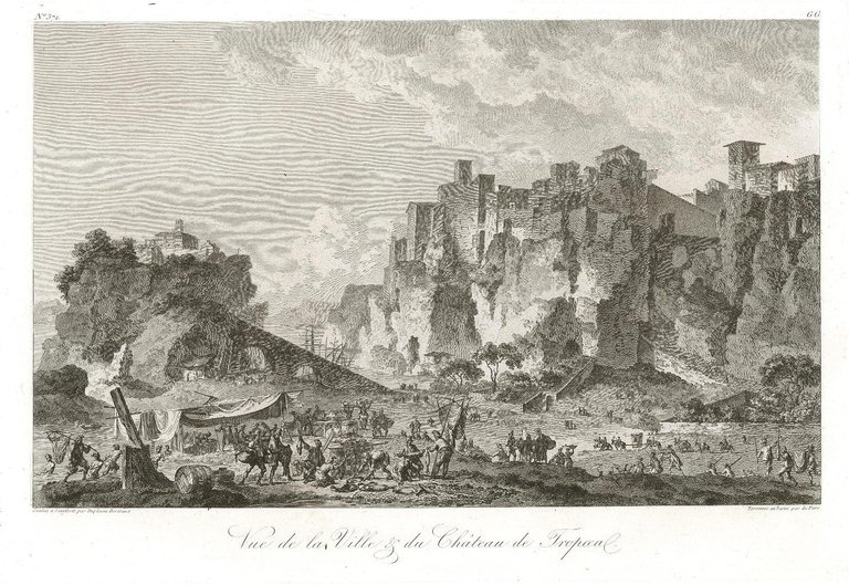 Bella veduta di Tropea e del suo castello, situati sulla rocca, animata da personaggi in primo piano. Incisa all'acquaforte da Duplessis Berteaux e terminata a bulino da Parc