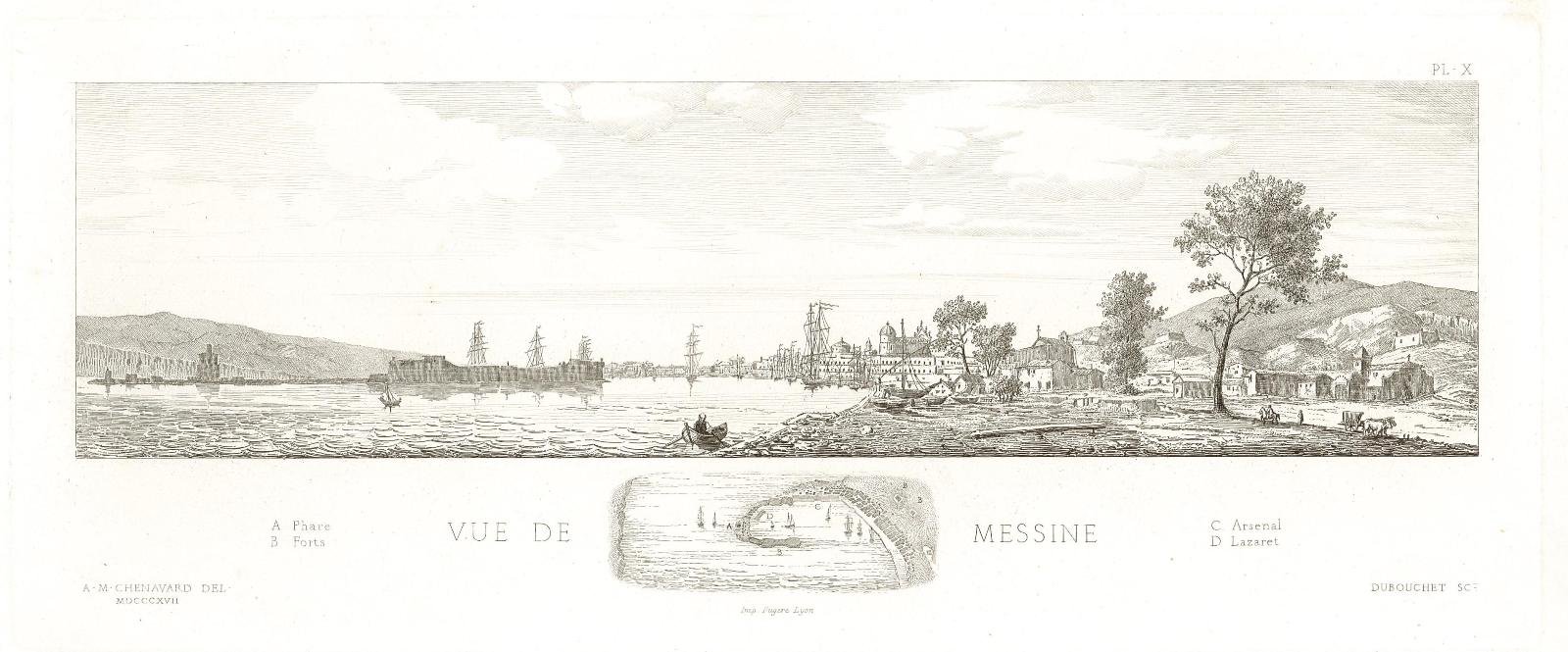Veduta della cittadina di Messina ripresa dalla riva. In basso al centro la raffigurazione planimetrica del porto cittadino. L'incisione è accompagnata da un foglio di testo storico decrittivo. Ottimo lo stato di conservazione generale.