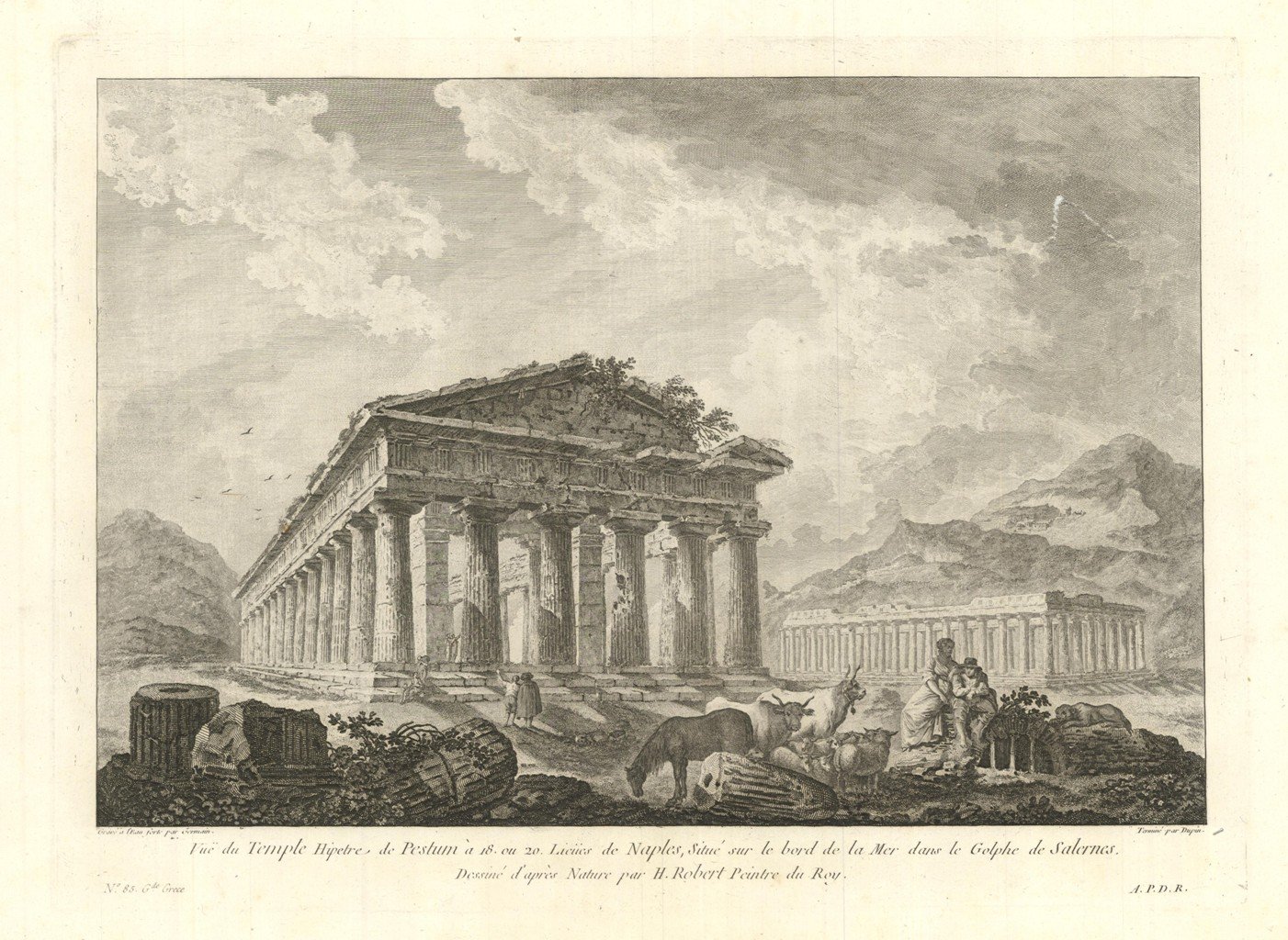 Veduta di uno dei templi di Pestum. Tratta dalla prima edizione della monumentale opera edita da Jean-Claude Richard de Saint-Non, meglio noto come Abate di Saint-Non " Voyage ou Description des Royaumes de Naples et de Sicilie ". Pubblicata a Parigi dal 1781 al 1786. Restauro nel cielo a destra
