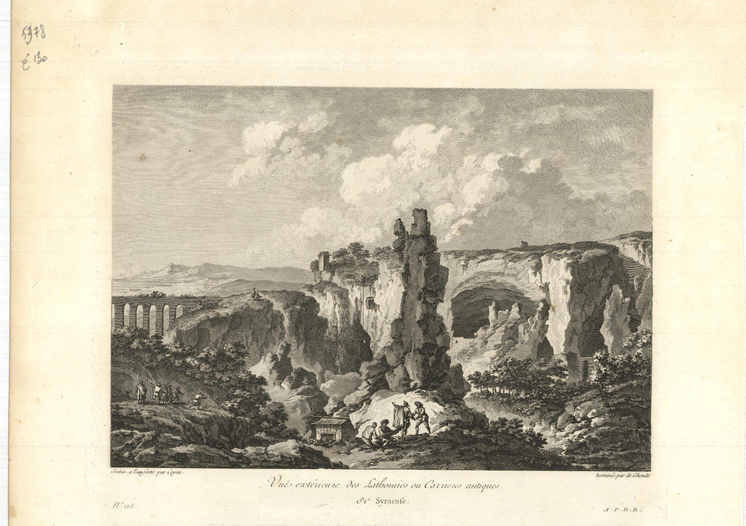 Veduta dell'esterno delle antiche grotte, nei pressi di Siracusa. Tratta dalla prima edizione della monumentale opera edita da Jean-Claude Richard de Saint-Non, meglio noto come Abate di Saint-Non " Voyage ou Description des Royaumes de Naples et de Sicilie ". Pubblicata a Parigi dal 1781 al 1786.