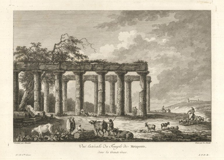 Animata veduta dei resti del tempio di Metaponto visto lateralmente. Tratta dalla prima edizione della monumentale opera edita da Jean-Claude Richard de Saint-Non, meglio noto come Abate di Saint-Non " Voyage ou Description des Royaumes de Naples et de Sicilie ". Pubblicata a Parigi dal 1781 al 1786.