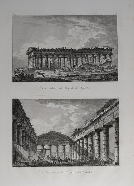 Veduta pubblicata nel ' Voyage Pittoresque ou description des Royaumes de Naples et de Sicile, opera in 5 volumi per la prima volta stampati a Parigi tra 1781 e il 1786. Richard de Saint-Non conobbe, durante il suo viaggio a Roma, i due già celebri pittori francesi Jean Honoré Fragonard e Hubert Robert, con i quali prosegue il suo viaggio per tutto il paese. Da questa grande amicizia nasce l’idea e la collaborazione per l’ambizioso progetto di documentare graficamente tutti i principali monumenti dell’Italia Meridionale e della Sicilia. Da qui, tra il 1781 ed il 1786, con l’aiuto di numerosi ed importanti architetti, pittori ed incisori, venne alla luce il Voyage Pittoresque ou description des Royaume de Naples et de Sicilie, opera composta di cinque volumi che uscirono annualmente. Incredibile sforzo tipografico, l’opera raccoglie quasi per intero gli appunti di viaggio del Saint-Non, adeguatamente assemblati e corretti; il corpus grafico è composto di ben 542 incisioni all’acquaforte e bulino, opera dei principali artisti di riproduzione del periodo. Da un punto di vista editoriale l’iniziativa riscuote immediatamente un grandissimo successo: il libro diviene un vero e proprio modello tipografico, sul quale sono basate diverse pubblicazioni dell’impero napoleonico. Dal punto di vista artistico le vedute, i paesaggi e le rovine conservano, e non può essere altrimenti, lo stile pittorico e romantico del Fragonard, del Robert, del Desprez, e di tutti gli altri artisti che collaborano nella realizzazione di questa monumentale opera. Il notevole successo commerciale della raccolta è testimoniato dalla ristampa, tra il 1795 ed il 1798, delle sole tavole pittoriche. Un’ulteriore edizione è stampata nel 1829 dal Dufour. Esemplare tratto dal ' Voyage Pittoresque, ' seconda edizione del 1795/98, priva dell’indicazione del privilegio reale. ' Acquaforte, stampata su carta vergata coeva, leggere ossidazioni, per il resto in ottimo stato di conservazione. View taken from the Voyage Pittoresque ou description des Royaume de Naples et de Sicilie by Richard de Saint-Non. During his trip to Rome, Richard de Saint-Non met two already famous French painters, Jean Honoré Fragonard and Hubert Robert, with whom he travelled along Italy. Their friendship led to the cooperation for the ambitious project of depicting all the main monuments of Southern Italy and Sicily. Between 1781 and 1786, with the assistance of many contemporary artists, he realized the Voyage Pittoresque ou description des Royaume de Naples et de Sicilie, a five volumes work published annually. As a result of a great typographical effort, the work is a collection of Sain-Non’s travelling notes; the graphic part is made up of 542 engravings and etchings, realized by the most important artists of the period. The work is immediately successful, for the book became a new typographical model for the following publications. From an artistic point of view, the views, landscapes and antiquity keep the Romantic pictorial style of Fragonard, Robert, Desprez and all the other artists that took part in this monumental project. The re-issue, between 1795 and 1798, of the pictorial plates, witnesses the great success of this project. A re-issue of the whole work was edited in 1829 by Dufour. Example taken from the second edition of the work, printed in Paris 1795/98; the plates are without the Royal priviledge. ' Etching, printed on contemporary laid paper, light foxing, otherwise good condition. Cfr.