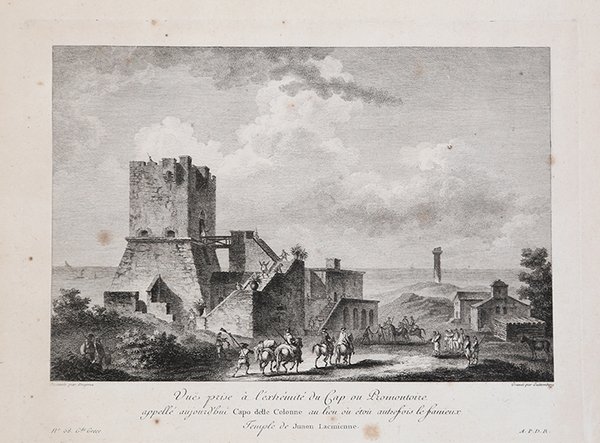 Veduta pubblicata nel ' Voyage Pittoresque ou description des Royaumes de Naples et de Sicile, opera in 5 volumi per la prima volta stampati a Parigi tra 1781 e il 1786. Richard de Saint-Non conobbe, durante il suo viaggio a Roma, i due già celebri pittori francesi Jean Honoré Fragonard e Hubert Robert, con i quali prosegue il suo viaggio per tutto il paese. Da questa grande amicizia nasce l’idea e la collaborazione per l’ambizioso progetto di documentare graficamente tutti i principali monumenti dell’Italia Meridionale e della Sicilia. Da qui, tra il 1781 ed il 1786, con l’aiuto di numerosi ed importanti architetti, pittori ed incisori, venne alla luce il Voyage Pittoresque ou description des Royaume de Naples et de Sicilie, opera composta di cinque volumi che uscirono annualmente. Incredibile sforzo tipografico, l’opera raccoglie quasi per intero gli appunti di viaggio del Saint-Non, adeguatamente assemblati e corretti; il corpus grafico è composto di ben 542 incisioni all’acquaforte e bulino, opera dei principali artisti di riproduzione del periodo. Da un punto di vista editoriale l’iniziativa riscuote immediatamente un grandissimo successo: il libro diviene un vero e proprio modello tipografico, sul quale sono basate diverse pubblicazioni dell’impero napoleonico. Dal punto di vista artistico le vedute, i paesaggi e le rovine conservano, e non può essere altrimenti, lo stile pittorico e romantico del Fragonard, del Robert, del Desprez, e di tutti gli altri artisti che collaborano nella realizzazione di questa monumentale opera. Il notevole successo commerciale della raccolta è testimoniato dalla ristampa, tra il 1795 ed il 1798, delle sole tavole pittoriche. Un’ulteriore edizione è stampata nel 1829 dal Dufour. Esemplare tratto dal ' Voyage Pittoresque, ' prima edizione con l’acronimo del privilegio reale. ' Acquaforte, stampata su carta vergata coeva, leggere ossidazioni, per il resto in ottimo stato di conservazione. View taken from the Voyage Pittoresque ou description des Royaume de Naples et de Sicilie by Richard de Saint-Non. During his trip to Rome, Richard de Saint-Non met two already famous French painters, Jean Honoré Fragonard and Hubert Robert, with whom he travelled along Italy. Their friendship led to the cooperation for the ambitious project of depicting all the main monuments of Southern Italy and Sicily. Between 1781 and 1786, with the assistance of many contemporary artists, he realized the Voyage Pittoresque ou description des Royaume de Naples et de Sicilie, a five volumes work published annually. As a result of a great typographical effort, the work is a collection of Sain-Non’s travelling notes; the graphic part is made up of 542 engravings and etchings, realized by the most important artists of the period. The work is immediately successful, for the book became a new typographical model for the following publications. From an artistic point of view, the views, landscapes and antiquity keep the Romantic pictorial style of Fragonard, Robert, Desprez and all the other artists that took part in this monumental project. The re-issue, between 1795 and 1798, of the pictorial plates, witnesses the great success of this project. A re-issue of the whole work was edited in 1829 by Dufour. Example taken from the first edition of the work, with the acronym of the Royal priviledge. ' Etching, printed on contemporary laid paper, light foxing, otherwise good condition. Cfr.