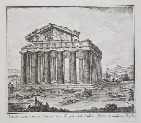 Veduta delle rovine dei templi greci, tratta da Les Plus Beaux Monuments de Rome ancienne pubbliicata a Roma da Bouchard & Gravier - Komarek, nel 1761. Ricca ed elegante raccolta testuale ed iconografica delle bellezze artistiche e architettoniche di Roma antica e moderna. Le grandi tavole con ampi margini sono realizzate, principalmente, da Barbault; altri incisori delle tavole furono Montagu, Bouchard, Freicenet. Barbault si differenziò dal suo rivale artistico Giambattista Piranesi scegliendo di rappresentare edifici ed antichi monumenti che Piranesi aveva raffigurato da angolazioni e punti di vista differenti, cosicché potesse colmare i vuoti iconografici che potevano trovarsi nei lavori dell'architetto. Incisione in rame, in ottimo stato di conservazione. Taken from Les Plus Beaux Monuments de Rome ancienne, printed in Rome by Bouchard & Gravier - Komarek, 1761. The work is a rich and elegant textual and iconographic collection of the artistic and architectural beauties of ancient and modern Rome. The plates - often with wide margins - are mainly made by Barbault; other engravers on the plates were Montagu, Bouchard, Freicenet. Barbault differentiated himself from his artistic rival Giambattista Piranesi, choosing to represent buildings and ancient monuments that Piranesi had portrayed from different angles and points of view, so that he could fill the iconographic gaps that could be found in the architect's works. Copperplate, in very good conditions. Cfr. Rossetti 755; Berlin Katalog 1897; Cicognara 3593.
