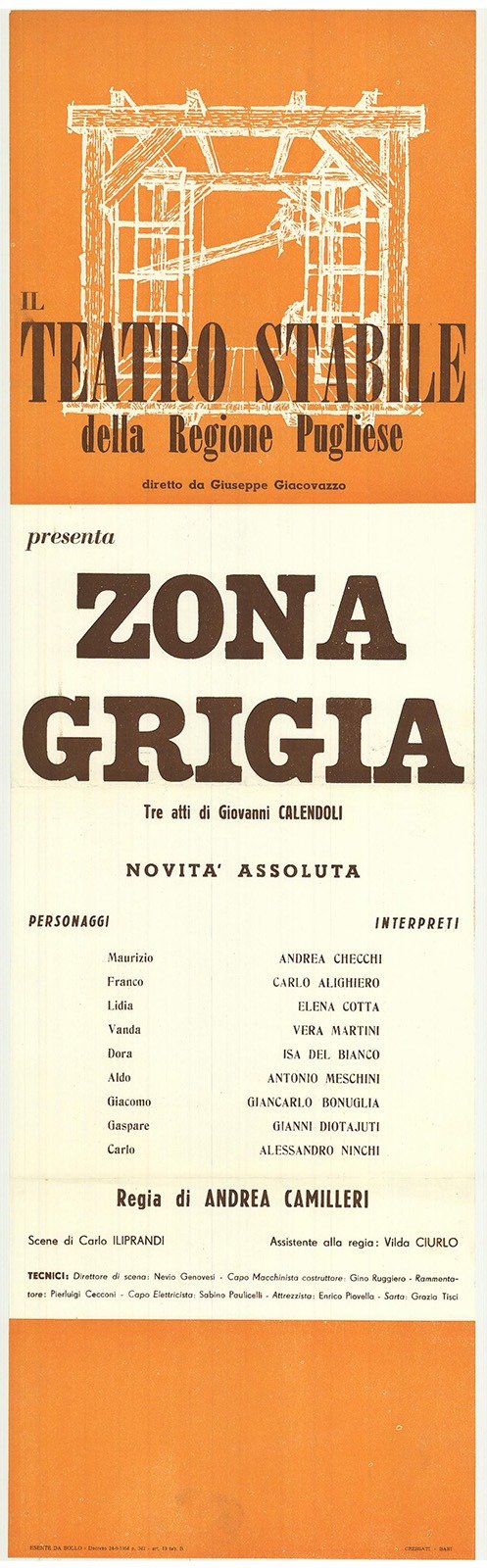 Tre atti di Giovanni Calendoli, regia di Andrea Camillleri. Teatro Stabile della Regione Pugliese diretto da Giuseppe Giacovazzo. Cressati - Bari. Locandina ripiegata più volte